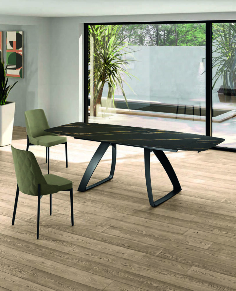 Barrel è un tavolo allungabile con la piana a botte caratterizzato da un top in ceramica e una base in metallo nero.