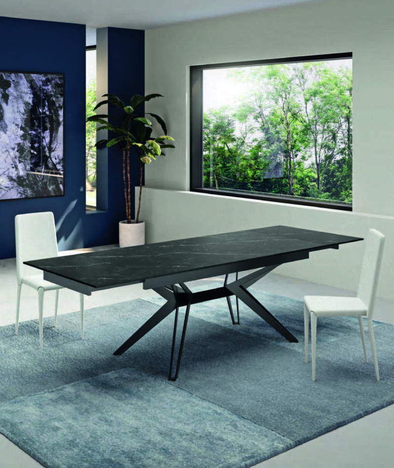 Tavolo Match 3 caratterizzato dall’elegante top realizzato in ceramica che si abbina con gusto alla solida base in metallo nero.